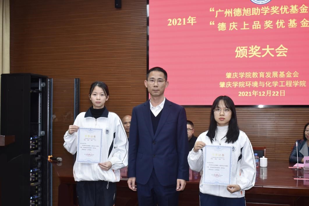 德旭新材料(广州)股份有限公司总经理何彦波先生为获得304.cam永利集团 “2021年德旭精细化工专业励志奖学金”的同学颁奖